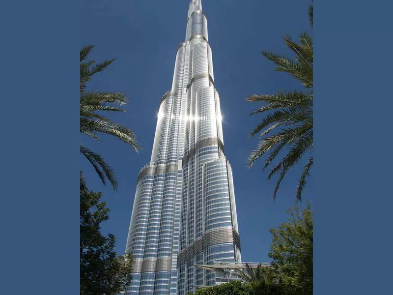 Durj Дубайдагы Бурж Халифа, БАЭ, бул дүйнөнүн эң бийик имараты, темир бетон гибриддик кадр. Ал 163 кабаттан жана 828 метрден ашуун бийиктикте турат.